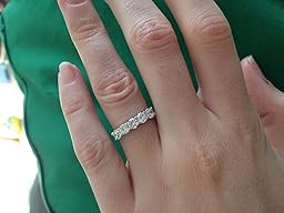 ring size true to size. great sparkle! carat size isn't too small, it's just right to maintain "realness" I think. it doesn't completely pass as diamonds, but almost. looks real enough to me, and no one has questioned it. makes a great anniversary ring! it also looks pretty nice with a wedding band. for the photos, for reference, I bought a size 6. my finger size is 5.75