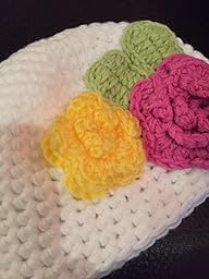 This is just precious. The pictures cannot show you the quality and detail in this adorable little piece. The little petals on the side are thick and 3D, they are easily plumped back up, and stay that way. They do not flatten against the hat and refuse to stand up. There are no visible seams, everything is just one piece, no irritation for baby's head.