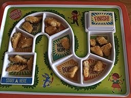 I love the idea of these plates and it is a great way to mix up what your kids eat and force them to eat more vegetables and fruits. However, the "YOU WIN" part of it should have some kinda lock on it, so sneaky children like mine don't go straight for the prize before finishing what's on their plate. So what I do now is tell them the lid is their "ticket" to their prize and they have to redeem them. It is harder to clean than other plates with compartments but this is obviously a novelty item. My kids think it's fun and as a parent I had fun filling up the tiny compartments with different things. Warning: the picture I show here is what happens when you ask your husband to fix lunch for the kids. 100% Chicken nuggets.