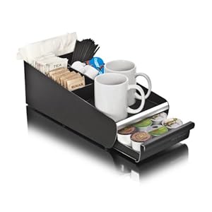 I just love this organizer. I was looking for something that I could put my creamer and sugar containers on,and also store my K-cups, and sweeteners. This is perfect. It looks great. I highly recommend this organizer.