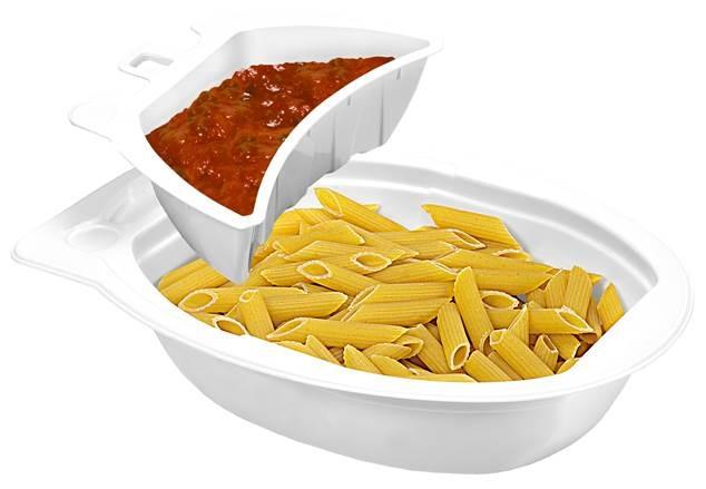 And the dish cooks in the microwave in just one minute with no muss or fuss. You simply pull back a corner of the cover to vent the sauce that's separated from the pasta in its own little sauce tray. Then one minute later, you remove the cover, pour the sauce over the nice al dente pasta, and enjoy.