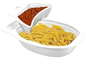 The product contains a larger plastic, microwavable bowl containing pre-cooked pasta, and a smaller bowl that contains the pasta sauce that rests in one end of the larger plastic bowl. The smaller bowl is not attached to the larger bowl, it just sits in it. Both the larger and smaller bowls are sealed shut with a thick plastic film cover.