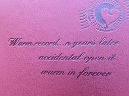 I purchased this as a gift for my sister. The product description doesn't mention the printing on the leather cover, but it reads, "Warm record. . .n years later accidental open in warm in forever." Yes, I typed that correctly. It is a lovely little journal with gibberish embedded in the leather cover. I can't give this as a gift, it is ridiculous.