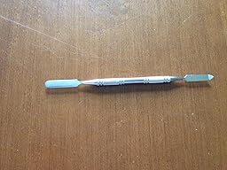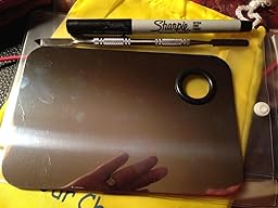 Great bargain, a must have if you love make up. I am not a professional, but makeup is a hobby and I want it all! I have always wanted one of these, just never invested in one yet. This one is superb! Perfect size, light weight enough to be easy to hold, but heavy enough it will not bend or break. It is very sturdy made, highly polished stainless steel just like a mirror on both sides. The picture makes it look white to me but it is not. The rubber ring makes it so comfortable to hold. I took a pic and I am not good with pics, but I put the fine point sharpie marker in there to show you the size of the spatula with something you could compare it to. It is highly polished also, pointed on one end and round on the other. Small enough to fit down in a narrow neck of a foundation bottle if need be but strong enough to not bend. Has a grip pattern on the handle so it doesn't roll around and slide in your fingers. It is polished enough the picture doesn't do it justice for color, the palette and spatula are both polished stainless regardless of what the color lt looks like, you can even see the reflection of my fingers holding the camera and a few smudges already from my fingers touching it.