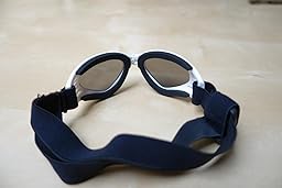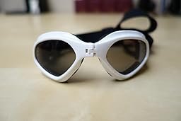 The foam that goes around the frames lets these sit comfortably on your dogs face. Two elastic straps hold them securely to your dogs head. I wasn't sure these would fit well on my dogs face since here head is quite narrow. But the frames are hinged in the middle allowing them to flex and adapt well to different head shapes.