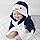 • Penguilicous navy-and-white, hooded, terrycloth spa robe with embroidered eyes, an orange 3D beak, and a terry tie at the waist