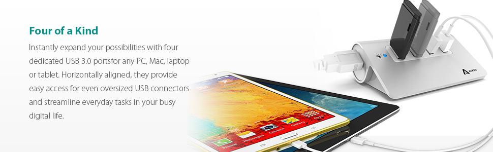 • Easily add four USB 3.0 ports to your PC, laptops and tablets, eliminating the trouble of switching among devices.