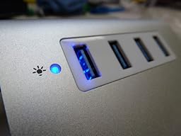 It has a very simple/minimal design to it. Mostly of aluminum silver metal and a soft white plastic at the bottom. The aluminum isn't a glossy shiny finish but more of a matte finish. Which I prefer. It has one blue LED to notify that the hub is connected to the computer. The port that is used to connect to the computer is on the left hand side while the ports at the top are used to connect peripherals. The bottom also has two non-skid rubber feet at the bottom. Which is great thing as I hate it when hubs or accessories move around when trying to use them. Simple and elegant enough design. It definitely has some Apple-ish design cues.
