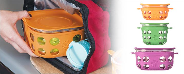 • 1-cup capacity glass mobile food storage container with protective silicone sleeve