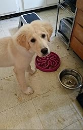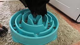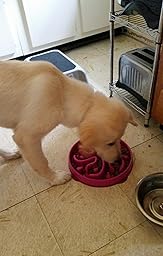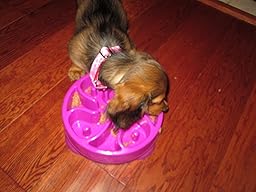 I rarely leave feedback and I don't know why as I love to read others... This is the best $15 I have spent in a very long time. We got a new puppy and she just inhaled her food and then threw it up. This little gem has taught her in no time how to eat slowly like a lady. Also she is full when she finishes eating and does not beg for food 24/7. There were several types of bowls but I picked this one because it seemed harder to eat fast... also it has rubber bottom so the bowl does not move when she is eating...