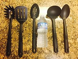 This set is exatly as advertised. The utensils are made of a surprisingly sturdy plastic. The pans have groovs on the bottom so that they dont slide, which is great. Overall Great Set!!! No negatives so far.
