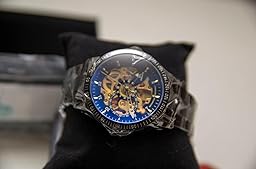 While I do enjoy the watch, it is not what I ordered. With other reviews point out that the blue hue is amazing, and damn, those pictures look nice, the watch I ordered and the watch I received were not the same. I made sure I was ordering the watch with blue crystal and dark grey band, as I had noticed there were different colors. The watch I received did have a dark grey band (thank goodness) but lacked the blue. It is a clear and plain black, with the gold innards. I enjoy the watch, but really wish I didn't get jipped on the color, as it looks a little boring compared to the pictures I've seen of the real deal. Keeps time well when worn daily, easy to wind. Band is obviously a little cheap, taking links out is a bit of a pain, but definitely 'do-it-yourself-able.' All in all 3/5 seems reasonable for the price.