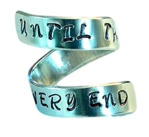 UNTIL THE VERY END quote ring. A Harry Potter Inspired quote on this aluminum ring. A description in the last Harry Potter book by JK Rowling 'Harry Potter and the Deathly Hallows' "The dedication of this book is split seven ways: to Neil, to Jessica, to David, to Kenzie, to Di, to Anne, and to you, if you have stuck with Harry until the very end." This ring is 1/4" wide and the thickness is approximately 1/16" (14 gauge). It has a beautiful satin finish or can be finished with a bright polish. The ring is some what adjustable. The rings are made out of Pure 1100 Aluminum, which is food safe and does not tarnish. They contain no Zinc or Magnesium which are often found in common aluminum and can cause skin reactions. Do not forget to provide your ring size on a note to me for best fit. Thanks for stopping by :)