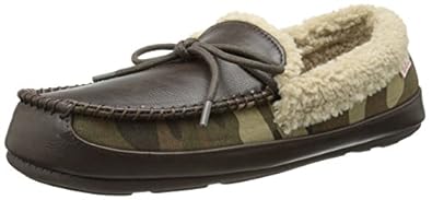 • Moccasin-style slipper featuring camo and faux-leather upper with whipstitched toe and soft berber lining