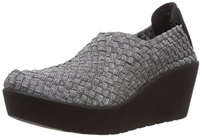 • Closed, slip-on wedge casually formed from stretchy woven elastic