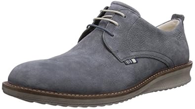 ECCO is a quality shoe worth the price and then some. I always have trouble finding shoes that fit comfortably, particularly out of the box. The key with ECCO seems to be the ability to make a shoe slightly roomier than the average shoe without giving a clunky look or feel. I have a 'thick' foot but not a wide 'duck' foot. Often a regular fit is a bit snug and a wide ends up with heel slippage. With these, the heel stays nicely cupped and the toe box gives you a little extra space for that 'all day' comfort. The bluish gray color compliments very nicely for casual or business casual. I wouldn't wear these with a suit and tie but they take a pair of chinos or jeans to the next level. I'm sure they would go well with a pair of flat front slacks and a sports shirt /button up as well. I've gone with the tan laces for now as they stand out a little more and match the sole well. I will likely mix the blue in at some point but it is always good to have a second set of laces handy.