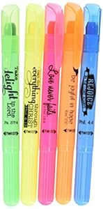 I use these highlighters in my Bible. I appreciate that they don't bleed through the page, but I wish that the brightness was more consistent - I finally threw away the blue one because it's hardly visible on the page. The pink is by far the brightest, followed by the orange. The yellow and green are about the same, and like I said, the blue is almost invisible. They are a bit waxy and the tip is broad, so it's hard to put the line exactly where I want it, but since I'm just outlining passages, that's not super-important to me. I wouldn't like to use these in a textbook, though.