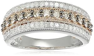 • Sterling silver ring featuring central row of champagne diamonds framed in rose gold-plated milgrain trim and flanked by two rows of white diamonds