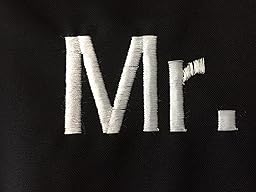 The white Mrs. Apron us a nice thick fabric and the embroidering is very accurate and perfect. However, the black Mr. Apron is the opposite! The fabric is think and ugly. I hold it against my laptop so you can actually see how thin it really is! It's like nylon stalkings! The embroidering is unfinished and hideous! Unbelievable how one can be so awesome and the other so disappointing!