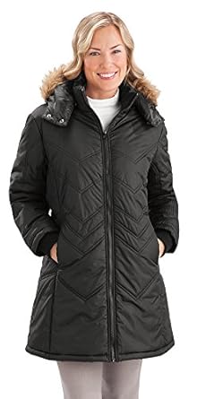 Stylish and comfy coat by Totes features a luxurious, quilted chevron pattern and has a convenient faux-fur removable hood. The mid-length coat is the perfect length for comfort and warmth and has a full-length zipper and two side seam pockets. Machine wash. Polyester; imported. Colors available in Black or Winter White. Sizes available in Misses: M(10-12), L(14-16) or Womens: XL(18-20), and XXL(22-24).