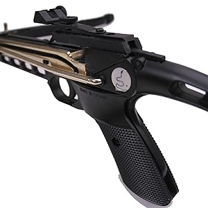 • Pistol-style, self-cocking crossbow with strong plastic body and compressed molded fiberglass bow