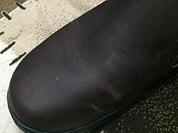 The boots had numerous scratches and the leather portion had tarnished chemical stain front side.