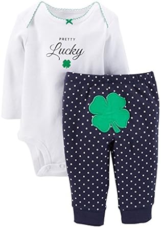 With a clover on the bottom and a coordinating bodysuit, this lucky set is just right for St. Paddy's Day, or cute for any day! Set includes 1 long-sleeve bodysuit and coordinating pant with bottom art appliqué Nickel-free snaps on reinforced panel and expandable shoulders for easy on and off Polka dot pants feature no-pinch elastic waistband and ribbed cuffs
