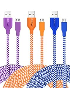• USB Charger Cable, OKRAY 3 Pack 10ft 3M Durable Braided Nylon Tangle-Free Micro USB 2.0 Charge Cable Sync Charging Cord for Android, Samsung, HTC, Nexus, Sony, Nokia and More (Blue Orange Purple)