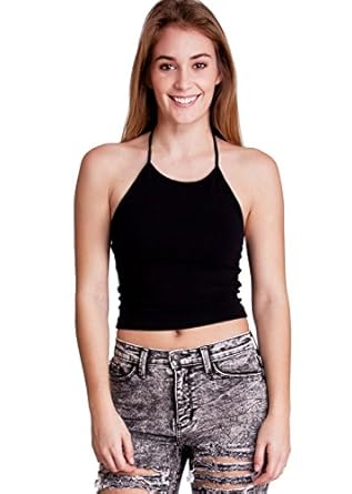Black Ladies Solid Color Crop Halter Top. This halter top features a basic color, a string neck tie, and a flirty length. Great with high-waist jeans, Colors available in Taupe, Navy, Mint, Royal Blue, Black, Coral, Heather Gray, Jade, White, Purple, and Dark Gray, Approximately 13" in length, 92% Cotton, 8% Spandex.