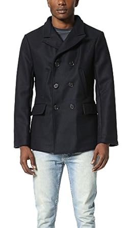 A modern Billy Reid pea coat crafted in crisp wool felt. The peak-lapel coat has leather under the collar and pocket flaps, natural horn buttons, and a single back vent. 4 front pockets. Unlined.