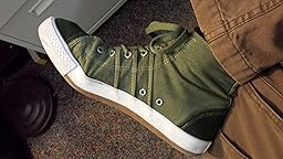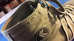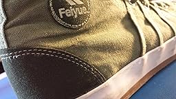 I have been using these Olive/Green Feiyue Hi Top Ventilate-styled shoes for a few months, now, and while they're not perfect, they're a wonderful pair of shoes and offer different support and characteristics compared to the Feiyue lo, hi-top or classic. One of the main differences you'll notice when wearing them is the flat/stable bottom--similar to a Converse, instead of the more rounded and ribbed, slipper/martial art style of the others. The sole is a stylized cross-hatching (instead of ribbed) and adds a little flair (even though you will generally never see it). Keep in mind that these shoes follow the same trend with the other styles where they have little to no arc support. They seem to provide more grip than the regular Feiyues, though--for the time being, at least. I was drawn to the "layered" appearance on the sides, so they definitely stand out among the rest of my shoes. The color helps with that, as well. Comparatively, the fabric feels flimsy, yet it's light and more durable at the same time due to the quality of the cotton.