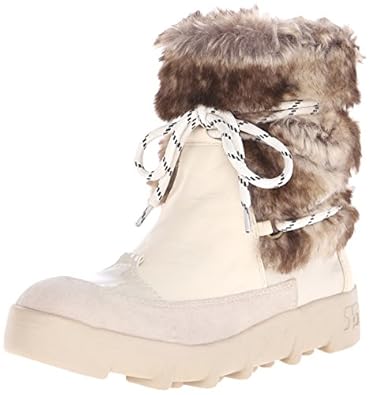 • Leather boot with suede and patent overlays featuring faux fur shaft and wraparound laces