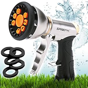 • SprayTec Garden Hose Nozzle Sprayer - Heavy Duty Metal Spray Gun w/ Pistol Grip Trigger. 9 Adjustable Patterns Best For Hand Watering Plants & Lawn, Car Washing, Patio, Dog & More. Leak Free Guarantee