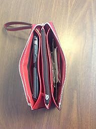 The red leather makes it very classy (and it is the PERFECT red color, which is my favorite). It holds 6 + credit cards (or the like), has a middle zipper area for coins or stuff you don't want just slipping out, as well as several other little compartments to hold papers or whatnot in its accordion style.