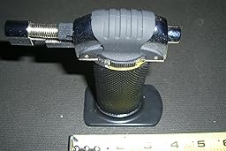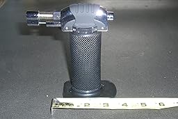 I've been getting into a baking/cooking kick lately, and thought it'd be nice to have a kitchen blow torch to use for more involved recipes. This item arrived in a timely manner, and was in great, brand-new condition. On first appearance, it was exactly as advertised in the pictures. There were two pieces to the set, the torch itself, and the base that the torch can stand on (refer to pictures I've posted). There are two sides to the torch. One side has a sliding Off/Lock switch, and the other side has a +/- sliding switch to finely adjust flame. There is a button on the opposite end of the torch nozzle that you press to ignite the torch. To keep the torch engaged, you have to slide the Off/Lock switch to the lock position, then you can release the ignition button. The handle, the torch nozzle, and the torch ignition switch seems solidly built, heavy, and good ergonomics in the hand. However, my only gripe with this product are Off/Lock and +/- switches. The switches seem like they are made of flimsy cheap plastic, and for that I gave it one less star. But that's just from a visual quality standpoint, I didn't open up the torch so I can't really attest to the true quality of the inner parts. From a functional standpoint, the switches and the ignition button, and the torch itself works amazingly. There is a strong flame that can reach up to ~4 inches from nozzle tip to flame tip, and the flame size is easily adjustable with the sliding switch. I used it yesterday to give the steak on my bruschetta a little more color and it worked great. It should have no problem doing other tasks like creme-brulee, browning meringues, or even searing pork bellies. It's great little tool to help you improve food presentation. I'm happy with it now, but will update if a quality issue arise.Read more ›