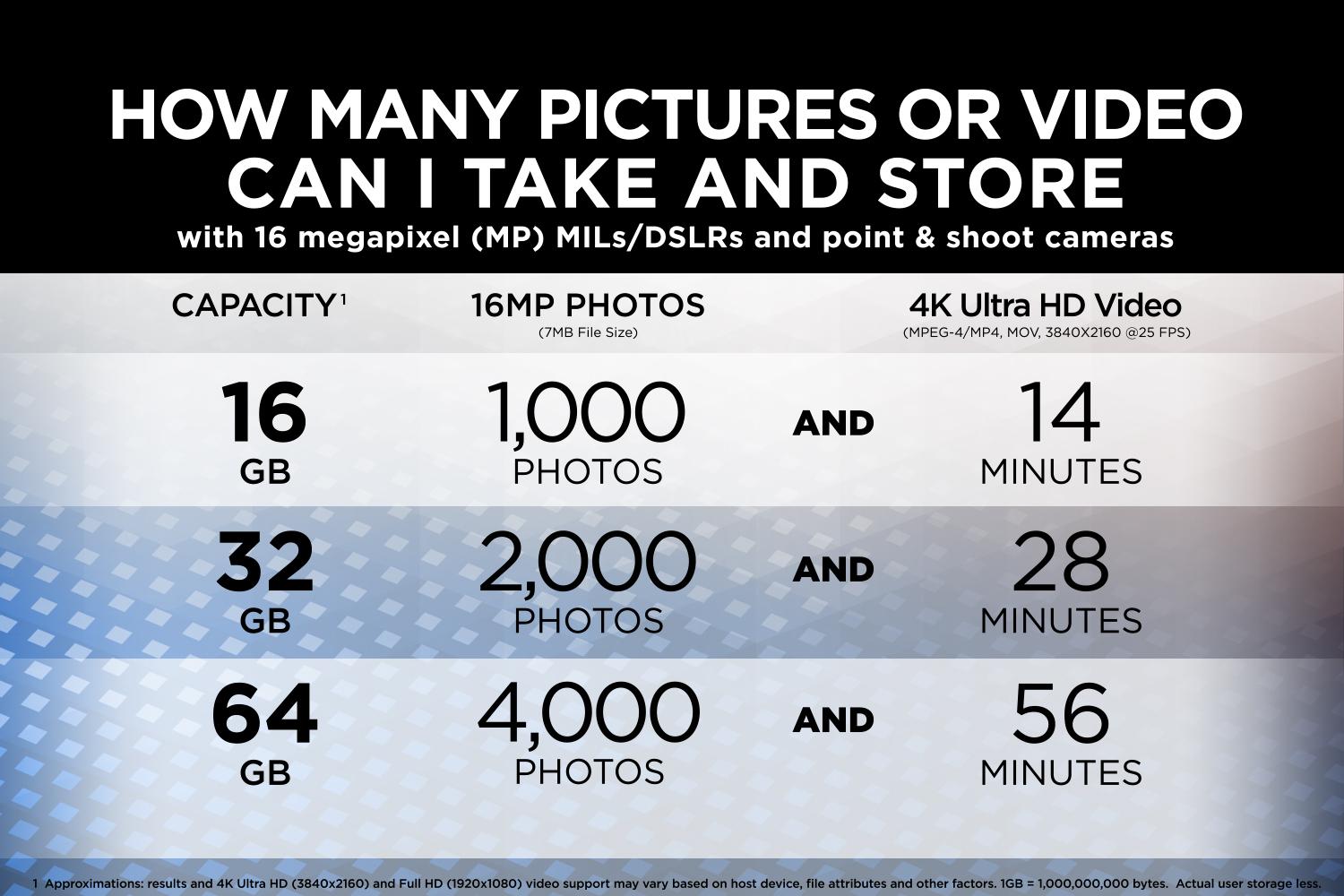 • Highest SD card video recording performance with both Class 10 and UHS speed Class 3 (U3) ratings for capturing Full HD and 4K Ultra HD (3840x2160p) for video