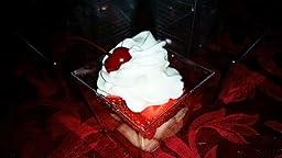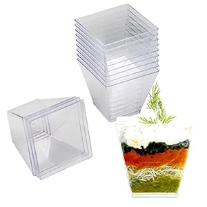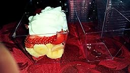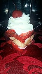 The modern tapered square shaped cups measured 2.75 inches high, 2.75 inches wide at the top and it tapers down to a 1.75 inches at the bottom. The amount of food it can hold will depend on the type of food I decide to put in it. I can see cold soups like a colorful gazpacho with a celery stick for a garnish. I can also see a layered desert like a cheesecake with fruit, a pudding layered or yogurt fruit and granola. There are so many unless possibilities. These clear cups are sturdier than I thought they would be. I was pleased with the overall design and I have not found any imperfections or breakage which is a good thing in my book. The cup are designed to be disposable, but I think they could be washed and reused a few more times if someone wanted to go to the trouble.