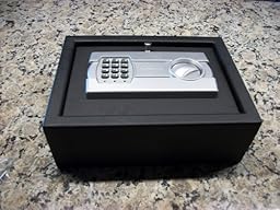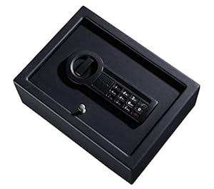 This is a solid and relatively, heavy case comprised of thick steel. The finish is a matte black. The keypad is plastic and takes a 4 to 8 number combination. A key cover houses the keyhole so it has a dual capability for access. A small handle allows you to lift the door open.