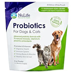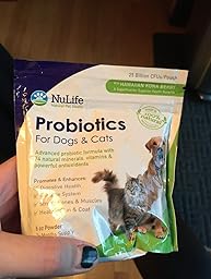 I take probiotics myself and am very happy to be able to give the immune and digestion boost to my furry friends! Without probiotics one has deadly gas, another scratches herself so much she rubs fur off . I have tried another brand of a chew able tablet but they wanted nothing to do with it so i was a little leery about trying this. It is a powder that just mixes in with moist food, actually, I just sprinkle it on the top, no problem. Results: less smell, little box also smells better, no more hairless skin and an older cat is more playful. Powder is easy to use, comes with a tiny measuring scoop, looks to be about 1/2 teaspoon, 1/2 scoop for under 10 pounds, 1 scoop for over 10 pounds for cats. For dogs 1/2 scoop for under 50 pounds, 1 scoop for over 50 pounds so apparently cats need more. NuLife Probiotics for Cats and Dogs has 5 strains of probiotics, It also has kona berry, an antioxidant that fights aging and multiple health conditions, and calcium (organic coral calcium) for strong bones/teeth. It also seems like there is less shedding with probiotic usage.