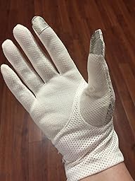 Now that I've explained my purpose for the gloves, let me tell you what I think of them...they are simply adorable! The picture does not do them justice. The back is a nice stretchy lace with a lace and pearl attached at the wrist. The underside of the wrist is a soft mesh-like material and the palm and finger area is made out of some material that grips (perfect for driving). This grippy area isn't too knobby, but is a light texture -- if that makes sense. The thumb and pointer fingertips are covered in the material touch screens seem to like.These gloves fit perfectly, not tight/not loose.