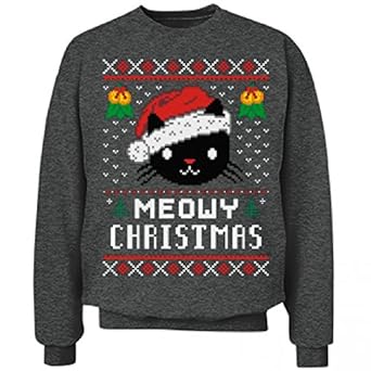HO HO HO! MEOWY CHRISTMAS! Snap up this funny and adorable kitty cat sweatshirt to wear to your Holiday parties this year. Wish everyone a very Meowy Christmas with this cool ugly sweater. Santa Claus is coming to town. This low pill fleece sweatshirt from Hanes will look good wash after wash.