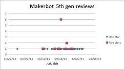 I have a two year old Replicator 2 which has served me well; not without issues with the feeder and some Makerware hiccups- but overall it has been very solid. With almost 1000 hrs of print time, it seemed like a good time to look for its replacement, since I assumed technology has advanced. While reading the reviews of the Makerbot 5th gen, a very disturbing trend emerged. One third of the five star reviews occurred on just a single day (10/14/2014)- while not one day of one-star reviews- of which there are twice as many- had two reviews. Similarly, the positive reviews were brief, and often by Amazon users with no or very few other reviews, opposite of the one star reviews. I created a chart (hopefully it makes it through) to show the distribution of 1 and 5 star reviews by date- it speaks for itself. Draw your own conclusions- but I'm staying clear of this product.