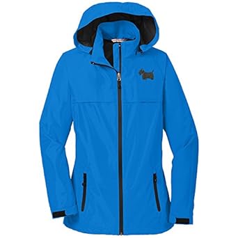 Never leave you home without your ScottishTerrier Ladie's Rain jacket. Our versatile, fully seam-sealed jacket offers outstanding waterproof protection to keep you dry whether you're on the job or on the trail. Folds into a convenient carry pouch for easy, compact storage. Stylish and comfortable it has a zip-off hood, contrast waterproof zippers, and adjustable self-fabric tab cuffs with hook and loop closures. The front zippered pockets will keep your keys and dog bones dry. The open hem with locking drawcord will keep you dry in the most severe weather.