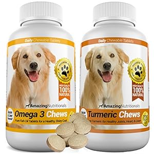 • LIMITED TIME ONLY select this affordable, powerful omegas and turmerics dogs (and cats) love to eat. Sold in specialty pet foods supply stores (Blue Buffalo) for $50 each, this combo 120 tablet bottles of both Amazing Omega and Amazing Turmeric chews available today on Amazon Prime, no coupons or prescription needed; But we only have a limited number of bottles to sell at this price, so this offer goes away soon; Click the ADD TO CART button at the top of this page to claim your bottle now