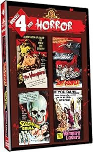This MOVIES 4 YOU: HORROR contains two good vampire films, and two tickets to Clunker-ville. THE VAMPIRE- A man accidentally takes the wrong pills for his headache. Unfortunately for him, they're vampire bat extract pills! Horror commences as he's transformed into the hideous blood-gulper of the title! Co-stars Kenneth Tobey (THE THING FROM ANOTHER WORLD, THE BEAST FROM 20,000 FATHOMS, IT CAME FROM BENEATH THE SEA) as the sheriff. THE BAT PEOPLE- A man gets bitten by a cave-bat while on vacation. This leads to an excruciatingly dull movie, w/ only the slightest bit of "horror" during the short finale. The actual creature is only shown for a few seconds! Certainly, not worth the slog! THE SCREAMING SKULL- A woman is plagued by her conniving husband's dead wife, along w/ a rolling, bouncing skull! Hilarious from beginning to end! Especially the preacher and his wife. Oh yeah, and the dim-witted gardener! Classic schlock! THE VAMPIRE LOVERS- Ingrid Pitt bares all in her lovely bath-time of fun! A gaggle of vampire babes accompany her exploits! A true masterwork of historic proportions! This collection is worth the purchase for Ms. Pitt alone!...