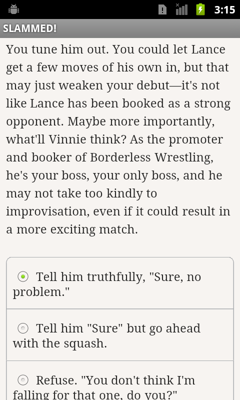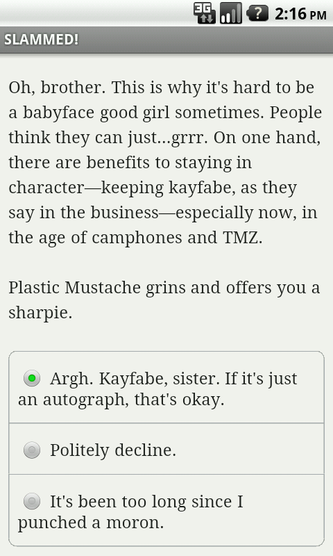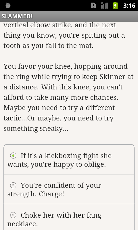 I can not recommend this amazing interactive fiction highly enough! All the excitement and twists and turns of professional wrestling, packaged with a phenomenal romance (OMG, Evan Ecstasy!) I learned SO MUCH about the wrestling world (with my prior knowledge being limited to what I'd seen on the Netflix show Glow). This was well-paced, fun, interesting and had a great cast of characters. Instantly one of my very favorites. Check it out, you won't be disappointed!