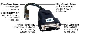 The UltraAV Mini DisplayPort to DVI Single-Link Active adapter features a protocol converter that accepts a single-mode Mini DisplayPort output from your video source such as a PC or laptop computer. Using your DVI cable, connect the adapter to a DVI monitor or projector. The adapter works with all DVI-D single-link monitors, displays and projectors, supporting a display resolution of up to WUXGA (1920x1200) at 8 bits of color per component. The UltraAV adapter offers user friendly and seamless conversion between a DisplayPort graphic source and DVI display device. The Mini DisplayPort to DVI Single-Link active adapter is fully compliant to both DPCP (DisplayPort Content Protection) and HDCP (High-Definition Content Protection) ensuring full compatibility and successful transmission of video content. The adapters Mini DisplayPort interface supports DisplayPort v1.1a and is DVI output compliant to the DDWG 1.0 standard. The adapter supports all HDTV resolutions including 1080p and color depths of up to 24-bits delivering the flexibility to meet most display application needs.