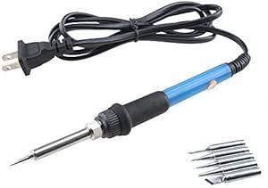 Product description Iron plated tip and stainless steel construction offer longer steel construction offer longer life High quality long lasting ceramic type heater.Adjustable temperature controlled soldering irons: 200-450 ° C (there is a knob wheel on the Electronic Soldering Gun for temperature adjust).Soldering Iron Length: 18 5cm Cable Length: 143cm Working Voltage: 110V Power: 60W . Operating:Clean the parts to be joined; Clean soldering iron tip and "tin" all faces of tip with a coating of solder; Heat parts (not solder )to be joined. Apply flux-core solder to heated parts, not tit till solder me soldering tip ,and heat it till solder melts and flows freely.