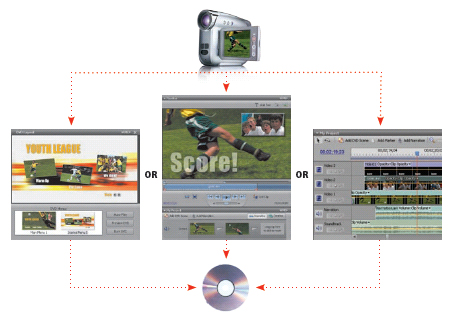 Move footage from camera to DVD in two simple steps, or drop it into the Sceneline, where you can easily rearrange clips and add effects with drag-and-drop simplicity. For more control, use the Timeline view, which offers more editing options. View larger. |