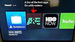 1. Playstation vue. (note: you do *not* need a playstation to sign up for this. I do not own one. I made my account from my computer on their website) This one is by far the most expensive monthly fee, but for us it is totally worth it for the amount of channels, content and recording capability. has a lot of our favorite channels. AMC, discovery, fox, tlc, spike, fx, nbc, bravo, the food network, just to name a few! This is by far our most used app, and you cannot get it on other devices, like a roku, which is one of the reasons why we went with the fireTV. And it was certainly the right decision for us. Once you get it set up and add your "favorite" shows, it will act as it's own dvr and records and saves your shows for 30 days after they air. Most channels you can fast forward through commercials, except for a few. Like abc, and fox. If you want to watch such channels without commercials you can do as we did and also subscribe to: